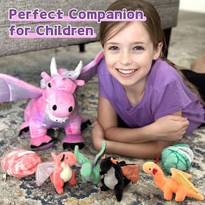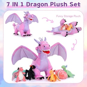 A pelúcia macia e fofinha de dragão mamãe de 54,9 cm com 4 bebês dragões de pelúcia e 2 ovos é perfeita para crianças de todas as idades. O design macio e abraçável da mamãe dragão e dos bebês dragões os torna ótimos para abraçar e brincar. Os detalhes realistas das escamas e asas do dragão fazem com que pareçam ainda mais realistas. Os 2 ovos são uma ótima adição ao conjunto e podem ser utilizados para brincadeiras imaginativas ou como adereços para contar histórias. Este conjunto de pelúcia de dragão é feito de materiais de alta qualidade e é durável o suficiente para uso prolongado. É um ótimo presente para crianças que amam dragões ou para quem quer adicionar um toque de fantasia à decoração de sua casa - ?Conjunto de pelúcia de dragão de 7 peças?Conjunto de pelúcia de dragão de 7 peças com 1 dragão mãe rosa, 4 dragões bebês e 2 ovos. Dragão grande tem um zíper na barriga, descubra a pequena surpresa escondida na barriga da mãe com seu filho - ?Durável e resistente à sujeira?Para fazer as asas de dragão de pelúcia se levantarem de forma mais realista, adicionamos papelão às asas, não lavável na máquina, o material resistente à sujeira pode ser limpo com uma toalha de papel úmida. Os dentes de pelúcia de dragão são feitos de tecido não tecido, que é muito macio e você não precisa se preocupar em machucar seu filho - ?Design de armazenamento?Há um zíper na barriga do brinquedo de pelúcia Mommy Dragon para caber em todos os dragões de pelúcia, o que é muito adequado para armazenamento e transporte quando sair para brincar. E isso ajuda a mãe a manter as salas de jogos limpas e organizadas - ?Brincadeira interativa? As cores brilhantes e múltiplas dos brinquedos macios de dragão melhoram a agilidade e a cognição das cores do seu filho, oferecendo a combinação perfeita para desenvolver habilidades sensoriais e incentivar o crescimento social e emocional. Vários brinquedos de pelúcia podem inspirar brincadeiras imaginativas em crianças - Ótimo presente: ideal para amantes de animais de pelúcia de dragões, este conjunto é um presente perfeito para aniversários, chás de bebê, Páscoa, Dia dos Namorados ou qualquer ocasião para crianças, bebês, meninos e meninas que amam dragões. Ajude as crianças a explorar os tempos pré-históricos