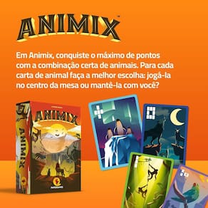 Animix Jogo de Cartas PaperGames BoardGame Em Animix, conquiste o máximo de pontos com a combinação certa de animais. Para cada carta de animal faça a melhor escolha: jogá-la no centro da mesa ou mantê-la com você As cartas à sua frente e as do centro da mesa devem formar uma mistura equilibrada, aumentando suas chances de vitória. No final do jogo, cada espécie marca pontos de maneira diferente, então seu planejamento será essencial para ter maioria no maior número de espécies e vencer a partida Componentes- 80 Cartas 63 x 88 mm - 30 Fichas de Montanha- Folheto de Regras Ficha TécnicaAutor: Mathieu BossuArte: Simon DouchyNúmero de Jogadores: 2 a 6Duração: 10 minutosPrincipais Mecânicas: Gerenciamento de Mão Seleção Aberta Colocação de Cartas Colecionar Conjuntos Construção a Partir de ModeloClassificação: Jogo FamiliaresCategoria: Jogo de Cartas Jogo de EntradaSKU Stock Keeping Unit : PPG-J067Código de Barras: 7898706770296Dimensões: 15,5 x 10,5 x 3,8 cmPeso: 300 gramas Destaques da Edição PaperGamesCaixa com Laminação Fosca, garantindo a conservação no longo prazo;Caixa com detalhes em Verniz Reserva UV brilhante;Materiais de alta qualidade e resistência, característica das produções da PaperGames.Homologação Inmetro: IP-BRI-2312/2021-03