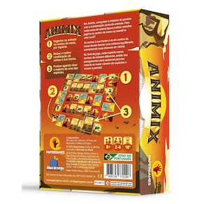 Animix Jogo de Cartas PaperGames BoardGame Em Animix, conquiste o máximo de pontos com a combinação certa de animais. Para cada carta de animal faça a melhor escolha: jogá-la no centro da mesa ou mantê-la com você As cartas à sua frente e as do centro da mesa devem formar uma mistura equilibrada, aumentando suas chances de vitória. No final do jogo, cada espécie marca pontos de maneira diferente, então seu planejamento será essencial para ter maioria no maior número de espécies e vencer a partida Componentes- 80 Cartas 63 x 88 mm - 30 Fichas de Montanha- Folheto de Regras Ficha TécnicaAutor: Mathieu BossuArte: Simon DouchyNúmero de Jogadores: 2 a 6Duração: 10 minutosPrincipais Mecânicas: Gerenciamento de Mão Seleção Aberta Colocação de Cartas Colecionar Conjuntos Construção a Partir de ModeloClassificação: Jogo FamiliaresCategoria: Jogo de Cartas Jogo de EntradaSKU Stock Keeping Unit : PPG-J067Código de Barras: 7898706770296Dimensões: 15,5 x 10,5 x 3,8 cmPeso: 300 gramas Destaques da Edição PaperGamesCaixa com Laminação Fosca, garantindo a conservação no longo prazo;Caixa com detalhes em Verniz Reserva UV brilhante;Materiais de alta qualidade e resistência, característica das produções da PaperGames.Homologação Inmetro: IP-BRI-2312/2021-03