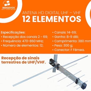 Destaques do Produto: Captação UHF (canais 14-69) e VHF (canais 2-13) 12 elementos para maior precisão no sinal Conector universal F fêmea