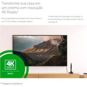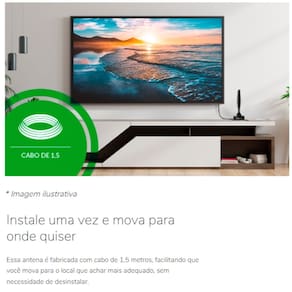 Especificações técnicas Característica Antena interna de TV Frequência de operação 470 a 860 MHz Banda de operação UHF Impedância 75 ohms Conector F macho Comprimento do cabo 1,5 metros Dimensões (L x A x P) Aprox.: 60 x 165 x 60 mm Prazo de garantia 1 ano