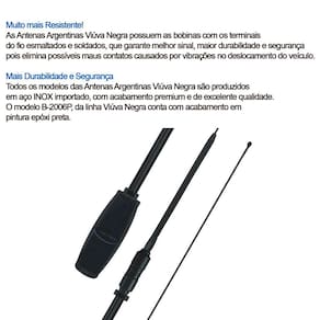 Todos os modelos das Antenas Argentinas Viúva Negra são produzidos em aço INOX importado, com acabamento premium e de excelente qualidade. O modelo B-2006P, da linha Viúva Negra conta com acabamento em pintura epóxi preta.As Antenas Argentinas e Viúva Negra possuem as bobinas com os terminais do fio esmaltados e soldados, que garante melhor sinal, maior durabilidade e segurança pois elimina possíveis maus contatos causados por vibrações no deslocamento do veículo.Com um design compacto, ela é muito menor que as antenas convencionais, porém, com um ganho até 2x maior. Além disso, possuem muitos difereciais:- Baixíssimo VSWR, que garente menos perdas na transmissão.- Produzidas em aço INOX importado, com acabamento premium e de excelente qualidade.- Tabela de ajuste de frequência exclusiva para os modelos Aquário.- Hastes telescópicas utilizadas para ajustar o tamanho e garantir a máxima potência dos produtos.Por possuírem hastes telescópicas, você pode ajustar o tamanho da antena de acordo com a sua necessidade para garantir que a antena opere na frequência desejada, obtendo assim uma melhor transmissão no seu rádio PX.Só a Aquário possui uma ?Tabela de Ajuste? exclusiva para as Antenas Argentinas e Viúva Negra, desenvolvida para auxiliar no ajuste da antena. O Manual de Instruções oferece todas as informações necessárias para te ajudar a instalar a antena e ajustá-la.Especificações Técnicas:Frequência: 23,5 - 32MHzVSWR: