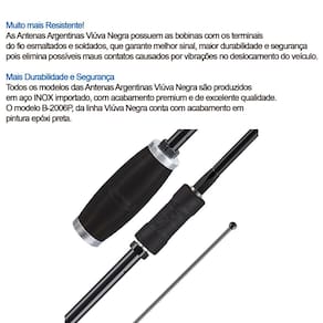 Todos os modelos das Antenas Argentinas Viúva Negra são produzidos em aço INOX importado, com acabamento premium e de excelente qualidade. O modelo B-2006P, da linha Viúva Negra conta com acabamento em pintura epóxi preta.As Antenas Argentinas e Viúva Negra possuem as bobinas com os terminais do fio esmaltados e soldados, que garante melhor sinal, maior durabilidade e segurança pois elimina possíveis maus contatos causados por vibrações no deslocamento do veículo.Com um design compacto, ela é muito menor que as antenas convencionais, porém, com um ganho até 2x maior. Além disso, possuem muitos difereciais:- Baixíssimo VSWR, que garente menos perdas na transmissão.- Produzidas em aço INOX importado, com acabamento premium e de excelente qualidade.- Tabela de ajuste de frequência exclusiva para os modelos Aquário.- Hastes telescópicas utilizadas para ajustar o tamanho e garantir a máxima potência dos produtos.Por possuírem hastes telescópicas, você pode ajustar o tamanho da antena de acordo com a sua necessidade para garantir que a antena opere na frequência desejada, obtendo assim uma melhor transmissão no seu rádio PX.Só a Aquário possui uma ?Tabela de Ajuste? exclusiva para as Antenas Argentinas e Viúva Negra, desenvolvida para auxiliar no ajuste da antena. O Manual de Instruções oferece todas as informações necessárias para te ajudar a instalar a antena e ajustá-la.Especificações Técnicas:Frequência: 23,5 - 32MHzVSWR: