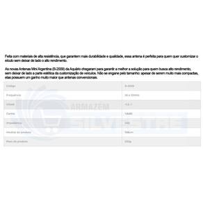 Feita com materiais de alta resistência, que garantem mais durabilidade e qualidade, essa antena é perfeita para quem quer customizar o veículo sem deixar de lado o alto rendimento.As novas Antenas Mini Argentina (B-2009P) da Aquário chegaram para garantir a melhor a solução para quem busca alto rendimento, sem deixar de lado a parte estética da customização de veículos. Não se engane pelo tamanho: apesar de serem muito mais compactas, elas possuem um ganho muito maior que antenas convencionais.Especificações Técnicas:Código: B-2009PFrequência: 26 a 32MHzVSWR: menor que 1.5 : 1Ganho: 1.8dBiImpedância: 50OMedida do produto: 108cmPeso do produto: 530gItens Inclusos:01 Antena Mini Argentina Black Viuva Negra B-2009P01 Suporte Dianteiro para Antena PX Capô Scania 112 11301 Kits de Parafusos Anti-Furto