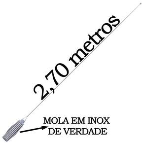 IDEAL PARA VEÍCULOS GRANDESAntena Móvel 1/4 de onda indicada para comunicação em veículos equipados com rádio PX. Apresenta excelente rendimento, caracterizando-se como a antena de maior alcance em operação móvel. Ela é produzida em aço inox especial, submetido a tratamento térmico, que faz com que a haste se mantenha sempre reta. A base, com sistema de molas, ajuda a diminuir o impacto e aumenta durabilidade da antena.BASE ESTÁVELA base conta com o sistema de molas que ajuda a diminuir o impacto, garantindo boa durabilidade.HASTE EM AÇO INOXProduzida em aço inox especial, submetido a tratamento térmico, que faz com que a haste se mantenha sempre reta.ALTO PADRÃO DE QUALIDADEO uso de materiais nobres como Aço Inox e o latão cromado, garantem a essa antena uma grande durabilidade. Você não terá que se preocupar por um bom tempo!MAIS SEGURANÇAA antena Marinox já possui sistema que permite a aplicação de Trava anti-furto, garantindo assim muito mais segurança.2,70 DE COMPRIMENTOMAIOR ALCANCE EM OPERAÇÃO MÓVELPRINCIPAIS BENEFÍCIOS- Maior alcance em operação móvel - Haste produzida em aço inox especial. Não deforma, mantendo-se sempre reta - Produzida com exclusivo sistema de trava que protege contra roubo - Proporciona conforto e segurança nas viagens, permitindo a comunicação rápida e eficiente via rádio - Sistema de mola que diminui o impacto e aumenta a durabilidade do produto - A instalação é feita com suporte e cabo - Alta resistência á corrosão, mesmo em regiões litorâneas - Produto nacional, com garantia de 1 ano contra defeitos de fabricaçãoESPECIFICAÇÕES TÉCNICASCÓDIGO DO PRODUTO: B-2003FREQUÊNCIA: 25 A 54MHZGANHO: 2.23DBIVSWR: menor que 1.5:1IMPEDÂNCIA: 50 OHMSPOTÊNCIA MÁXIMA:500WLARGURA DE FAIXA: 3.5MHZMATERIAL: AÇO INOX E LATÃO CROMADODIMENSÕES DO PRODUTO: 2,790MMPESO DO PRODUTO: 900G Itens Inclusos:01 Antena Móvel PX Mola Inox 2,70m B-200301 Suporte Traseiro Scania Série 5 Lado Motorista01 Cabo de 5,5 metros com conector B-300101 Parafuso antifurto R-30