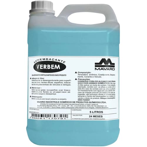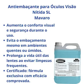 Especificações Técnicas - Fórmula eficiente: evita o embaçamento das lentes, garantindo visão clara. - Compatibilidade universal: pode ser utilizado em óculos, capacetes, máscaras e outros equipamentos. - Fácil aplicação: formato spray que proporciona uma distribuição uniforme do produto. - Embalagem: conteúdo de 5 litros para longa duração.