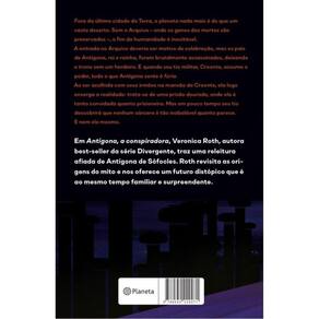 Em Antígona, a conspiradora, Veronica Roth, autora best-seller da série Divergente, traz uma releitura afiada de Antígona de Sófocles. Roth revisita as origens do mito e nos oferece um futuro distópico que é ao mesmo tempo familiar e surpreendente. Fora da última cidade da Terra, o planeta nada mais é do que um vasto deserto. Sem o Arquivo – onde os genes dos mortos são preservados –, o fim da humanidade é inevitável. A entrada no Arquivo deveria ser motivo de celebração, mas os pais de Antígona, rei e rainha, foram brutalmente assassinados, deixando o trono sem um herdeiro. E quando seu tio militar, Creonte, assume o poder, tudo o que Antígona sente é fúria. Ao ser acolhida com seus irmãos na mansão de Creonte, ela logo enxerga a realidade: trata-se de uma prisão dourada, onde ela é tanto convidada quanto prisioneira. Mas em pouco tempo seu tio descobrirá que nenhuma prisão é tão inabalável quanto parece. E nem ele mesmo.