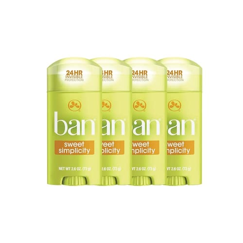 Antitranspirante invisível de 24 horas Ban Sweet Simplicity, desodorante sólido de 2,6 onças, proteção contra umidade nas axilas, com ingredientes que combatem odores (pacote com 4)
