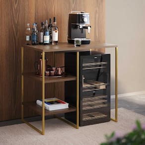 AS IMAGENS SÃO MERAMENTE ILUSTRATIVAS E PODEM SOFRER VARIAÇÕES DE COR E PEQUENOS DETALHES DE ACORDO COM O SEU MONITOR, ILUMINAÇÃO DO AMBIENTE E ATÉ MESMO A SUA PERCEPÇÃO VISUAL.Aparador Adega Industrial Bar Barzinho Bourbon AÃo Dourado e Carvalho 80 Cm