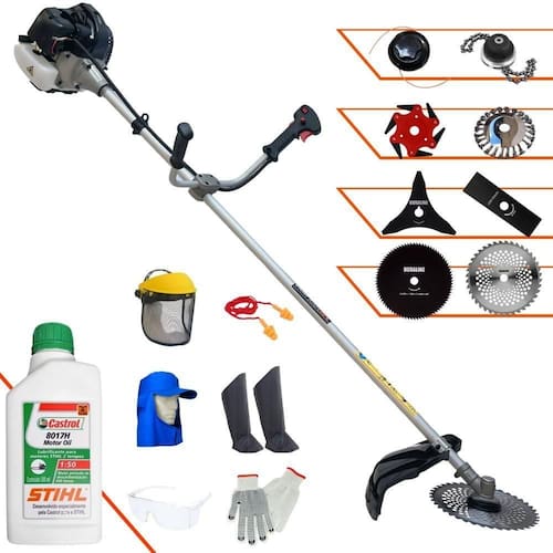 Roçadeira Lateral ANMAX CG430B À Gasolina 2 Tempos 43cc 1,7HP + Faca 3 Pontas 255m + Faca 6 Pontas 250mm + Faca 40 Dentes 255mm + Faca 80 Dentes 255mm + Escova Rotativa 24 cerdas + Trimmer + Óleo CASTROL STIHL 500ml + Kit EPI Completo