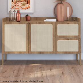 Aparador Balcão Buffet 139 Cm Pés Madeira 27969 Oslo, possui design sutil e elegante, é o móvel perfeito para valorizar ainda mais seu ambiente. Estrutura em MDP de 15 mm e fundo de HDF de 13 mm, ambos com acabamento BP. Possui 02 gavetas com corrediças telescópicas, 02 portas com dobradiças metálicas e ambas contam com aplique de tela sintética (PVC e poliester) e puxadores em poliestireno na cor dourada, agregando ainda mais nobreza ao móvel. Conta também com prateleira e divisória interna em MDP. Seus pés são confeccionados em madeira de eucalipto com sapatas emborrachadas afim de evitar atrito no piso do cômodo. Capacidade de peso suportado: 32kg (5kg em cada gaveta, 4kg na prateleira central e base, 10kg no tampo). Com seus traços suaves e paleta de cores acolhedoras, ele irá conferir sofisticação e aconchego ao seu ambiente. Este móvel chegará na sua casa separado em 02 volumes.