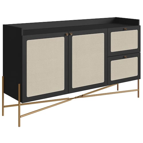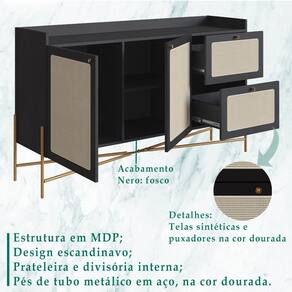 Aparador Balcão Buffet 139 Cm Pés Metal 28969 Oslo, possui design sutil e elegante, é o móvel perfeito para valorizar ainda mais seu ambiente. Estrutura em MDP de 15 mm e fundo de HDF de 13 mm, ambos com acabamento BP. Possui 02 gavetas com corrediças telescópicas, 02 portas com dobradiças metálicas e ambas contam com aplique de tela sintética (PVC e poliester) e puxadores em poliestireno na cor dourada, agregando ainda mais nobreza ao móvel. Conta também com prateleira e divisória interna em MDP. Seus pés são de tubo de metal em aço com pintura epóxi dourada e ponteiras plásticas, afim de evitar atrito no piso do cômodo. Capacidade de peso suportado: 32kg (5kg em cada gaveta, 4kg na prateleira central e base, 10kg no tampo). Com seus traços suaves e paleta de cores acolhedoras, ele irá conferir sofisticação e aconchego ao seu ambiente. Este móvel chegará na sua casa separado em 02 volumes.