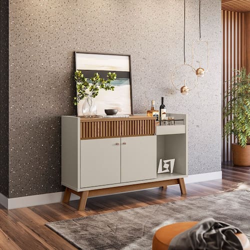 O Buffet Lucca vai encontrar o seu ambiente. Com design moderno, possui um gaveta com detalhe ripado e corrediça telescópica e ainda duas portas de abrir para voce guardar objetos que não precisam ficar à mostra. Possui uma porta bebidas com haste metálica e espelho. Com também com pés estilo retro, trazendo ainda mais elegância para o seu ambiente.