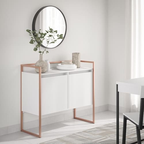 Feito em MDP com acabamento bordas em ABS. Estrutura em aço com pintura EPOXI nas cores cobre.