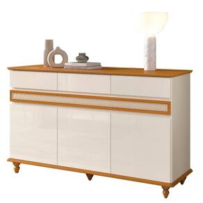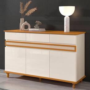 Características: Estrutura: MDP/MDF Possui tampo e base em MDF Acabamento em tela Rathan sintético 3 gavetas 3 portas 2 prateleiras internas Corrediças telescópicas Dobradiças metálicas Puxadores em cava 5 pés torneados em madeira maciça Peso suportado: 2 á 60kg
