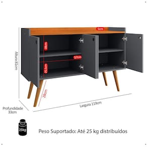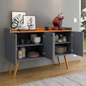 Ele conta com 4 portas, prateleiras internas e pés palito em madeira maciça, garantindo maior durabilidade ao produto. Também dispõe de um amplo tampo a qual pode ser utilizado para acomodar eletrodomésticos e itens decorativos.