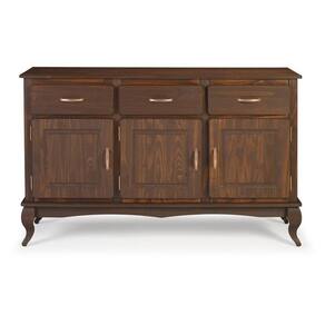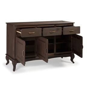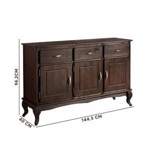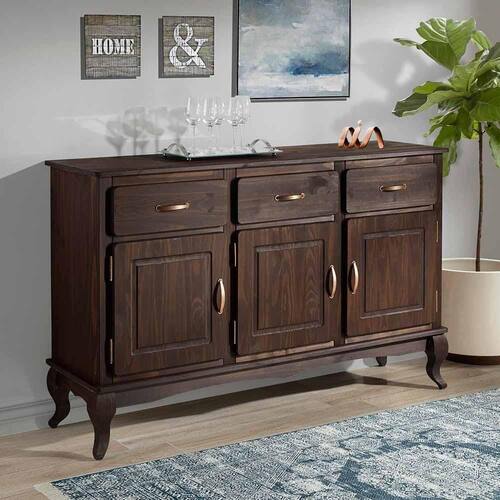 Com 3 portas e 3 gavetas espaçosas, o aparador organiza desde utensílios até objetos menores, mantendo tudo no lugar de forma prática. A prateleira interna amplia a capacidade de armazenamento, enquanto os puxadores metálicos e os pés no estilo Luís XV conferem charme atemporal e personalidade ao design rústico.