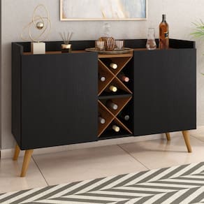 O aparador Buffet Zanzini Max é versátil, charmoso e delicado, perfeito para expor seus objetos de decoração com elegância e sofisticação, perfeito para compor ambientes como Hall de Entrada, Sala de Jantar, Sala de Estar. Contém tampo superior com formato estilo bandeja, portas nas extremidades, prateiras com excelente espaço interno e adega para 8 garrafas estilo "X" na parte central. Os pés estilo retro completam o visual incrível deste móvel.
