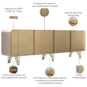 O Buffet é um móvel essencial para sala de jantar! A peça é a principal chave que combina elegância e funcionalidade. Com 04 portas oferecendo amplo espaço para guardar louças, talheres e outros objetos. O design arredondado confere um toque de sofisticação e modernidade ao ambiente, enquanto os pés em aço com acabamento dourado adicionam um brilho e requinte especial. O Buffet Santiago para quem busca um móvel de qualidade extrema, acompanhado de muita beleza, e pensado para praticidade dos seus dias! Adquira agora o seu!