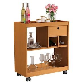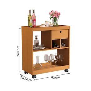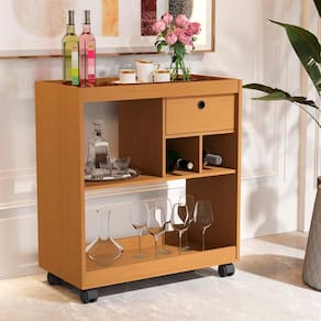 Compacto e funcional, possui gaveta com corrediça passante, prateleira para taças e espaço para bebidas e acessórios.
