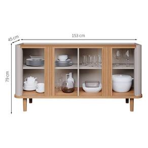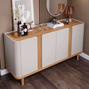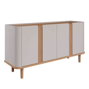 Aparador Buffet com 4 Portas Eva Off White Nature Quer deixar sua sala de jantar mais prática, organizada e com um toque de design requintado? Então você precisa de um móvel como o Buffet Eva! Enquanto o espaço interno garante uma ótima maneira de acomodar louças, travessas, copos e o que mais você precisar, o visual exterior conquista elogios e deixa seu lar-style ainda mais especial. Demais né? Agora é só aproveitar aquela refeição especial em família!\nMEDIDAS\nAltura 79 cm\nLargura 153 cm\nProfundidade 45 cm\nCARACTERÍSTICAS\nModelo Eva\nTipo do produto Buffet\nAmbiente Sala de Jantar\nMaterial MDF\nQuantidade de Portas 04\nTipo de Porta Bater\nQuantidade de Gavetas Não Possui\nTipo de Gaveta Não Possui\nTipo de Pés Fixo\nMaterial Pés Madeira\nAcabamento Pintura U.V.\nTipo de Dobradiças Slow Motion\nPossui Cantos Arredondados Sim\nNecessita Montagem Sim\nAcompanha Manual de Instalação Sim\nINFORMAÇÕES IMPORTANTES\nObjetos decorativos que porventura apareçam na foto, não acompanham o produto. Não nos responsabilizamos pela montagem/instalação dos produtos.\nMontagens, desmontagens e instalações são responsabilidades do cliente. Indicamos que contrate uma empresa de montagem ou um montador de sua confiança.\nAlém disso, favor verificar se os pés e acessórios estão dentro do forro inferior do produto. Em suma, todas as informações divulgadas sobre o produto são de responsabilidade do Fabricante.\nAs cores do produto podem variar de acordo com o seu monitor, a iluminação do ambiente em que você está e até mesmo a sua percepção visual. Além da cor, pequenos detalhes e acabamentos podem não ficar evidentes na foto, por isso as imagens são meramente ilustrativas.