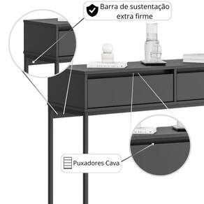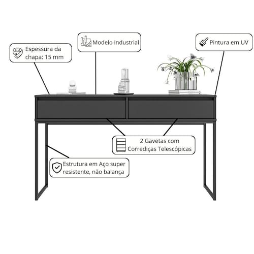 Feito em MDP com acabamento bordas em ABS. Estrutura em aço com pintura EPOXI nas cores preto.