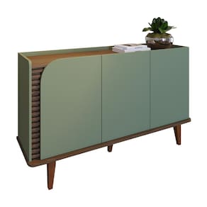 Deslumbre-se com o Buffet Jurerê, uma fusão perfeita de design retrô e contemporâneo, evidenciado pelos seus pés de madeira maciça e linhas orgânicas. Destaca-se pelos apliques ripados com 20mm de profundidade, realçados pela porta de quina usinada.