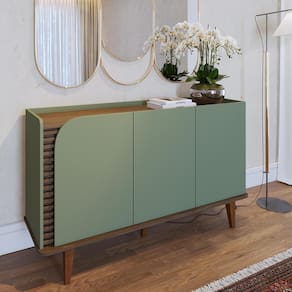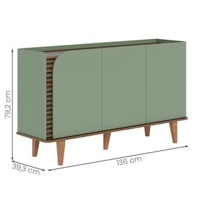 O tampo amadeirado, elegantemente recuado, proporciona a sensação de uma bandeja, definindo o caráter único deste buffet. Sua base com quinas arredondadas adiciona um toque suave à estrutura. Com 03 portas, o interior revela prateleiras reforçadas, perfeitas para a organização de louças.