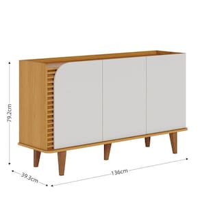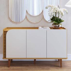 Apresentamos o Aparador Buffet da linha Jurerê, com um design retrô e contemporâneo, desenvolvido com materiais de alta qualidade MDP/MDF. Seus pés em madeira maciça e linhas orgânicas dando estabilidade para seu móvel e aquele toque de sofisticação. Possui duas portas, duas prateleiras internas reforçadas para organização dos seus utensílios domésticos. Três portas giro equipadas dobradiças metálicas. Seu detalhe destaca-se pelos aplique ripados nas portas realçando elegância. Seu tampo amadeirado recuado proporciona sensação de uma bandeja, uma ótima opção para exibir seus objetos ou até mesmo servir refeições. Seja para sua sala de jantar, ou sala de estar, será a escolha ideal para deixar sem ambiente mais aconchegante! Para você que procura funcionalidade, praticidade e beleza! Adquira já o seu!