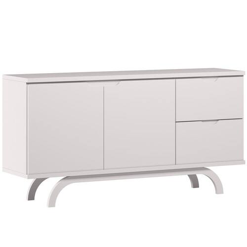 Características do Aparador: Estrutura em MDF 15mm. Produto na cor Off White com acabamento fosco. Pés com design curvo em MDF 25mm. 02 Portas e 02 gavetas com puxadores cava. Amplo espaço de armazenamento interno com prateleira. Gavetas com corrediças telescópicas.
