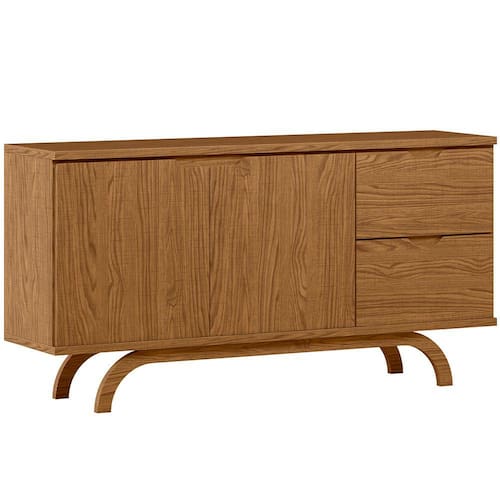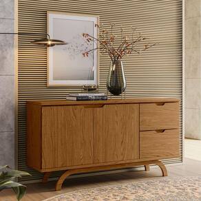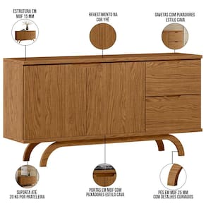 Características do Aparador: Estrutura em MDF 15mm. Produto na cor Ypê com acabamento fosco. Pés com design curvo em MDF 25mm. 02 Portas e 02 gavetas com puxadores cava. Amplo espaço de armazenamento interno com prateleira. Gavetas com corrediças telescópicas.