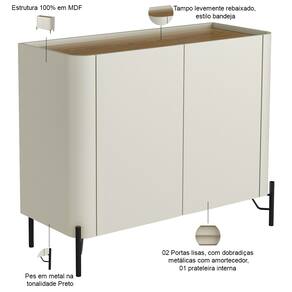 Fabricado em 100% MDF, esse buffet combina portas lisas e um design curvo - características do estilo orgânico - com pés metálicos industriais, criando um visual único e cheio de personalidade. Já com o tampo levemente rebaixado no estilo bandeja, esse aparador elegante oferece um espaço prático para exibir objetos decorativos ou servir drinks em encontros especiais. Por fim, seu amplo espaço interno garante organização sem comprometer a elegância, perfeito para guardar louças, toalhas ou itens de decoração.