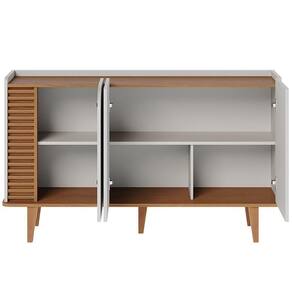 Criado para deixar qualquer ambiente deslumbrante, o Aparador Para Sala Buffet com 3 Portas Elora Off White Freijó, da Lyam Decor, é a combinação perfeita do design retrô e contemporâneo. Os pés de madeira maciça e linhas orgânicas evidenciam isso, ao passo que os apliques ripados destacam a porta de quina usinada. Já o tampo madeirado, elegantemente rebaixado, proporciona uma espécie de bandeja, o que esse balcão buffet único e cheio de personalidade. Para completar, a base com quinas arredondadas adiciona um toque suave à estrutura, enquanto o interior revela prateleiras reforçadas, perfeitas para a organização de louças e demais itens de jantar.