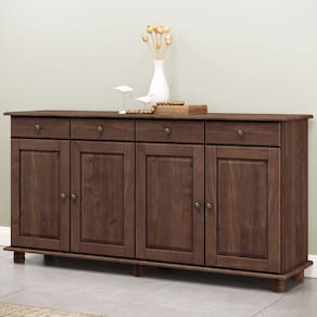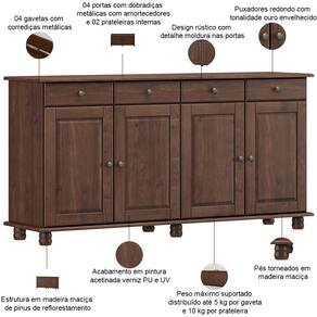 A começar pelo amplo espaço de armazenamento, com divisões internas inteligentes para organizar louças, cristais e mantimentos; gavetas práticas com sistema de deslize suave para talheres, toalhas e utensílios de mesa, além dos pés torneados e puxadores envelhecidos que contam histórias de tradição, enquanto possui acabamento perfeito para ambientes que exigem durabilidade e personalidade. Seja para cozinha de fazenda ou para uma cozinha rústica urbana, esse balcão buffet é a escolha certa.