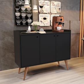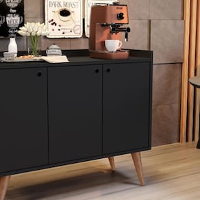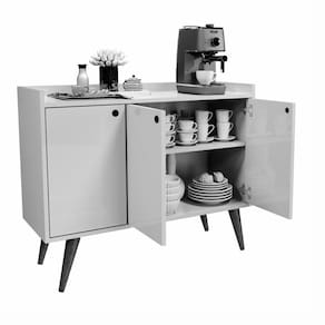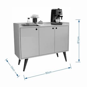 Aparador Buffet Retrô 3 Portas Wood Prime é ideal para sua sala! Com designer retrô ele irá agregar muito mais charme e requinte ao seu ambiente. Possui três portas com dobradiças metálicas, e amplo nicho interno. Duas prateleiras, sendo uma delas a altura ajustável ou até mesmo removível. Amplo tampo para acomodar bebidas, objetos de decoração, taças etc. Elaborado em MDP com pés em madeira maciça, esses atributos garantem ao produto maior resistência e durabilidade.