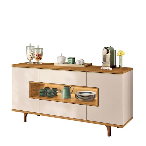 Com design sofisticado, possui 3 portas sendo 2 em vidro e nicho central com iluminação LED que valoriza seus objetos decorativos.