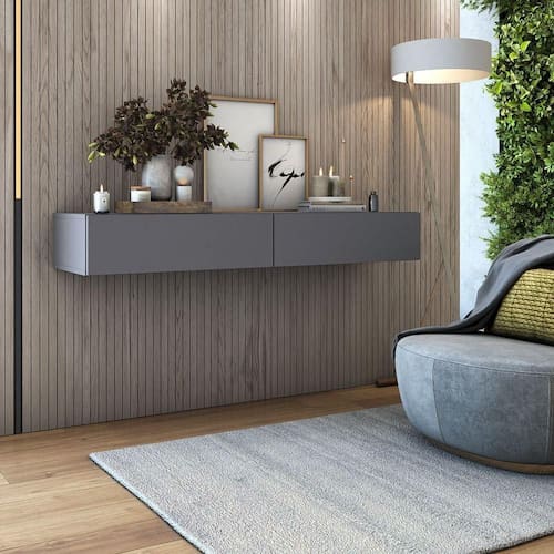 Com linhas modernas e acabamento clean, o aparador suspenso é a escolha perfeita para quem busca sofisticação com funcionalidade. As duas gavetas amplas e discretas mantêm tudo organizado, sem abrir mão do estilo.