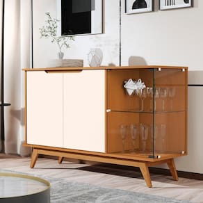 Com portas bem distribuídas, incluindo uma de vidro com prateleira elegante, é ideal para organizar utensílios e expor taças com estilo.