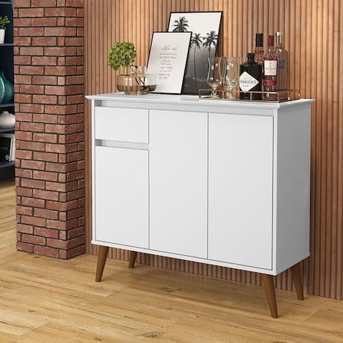 Buffet, Aparador, Veneza, EJ Móveis, MDP, MDF, Pés Palito, Madeira Maciça, Design Retrô, 3 Portas, 1 Gaveta, Dobradiças Metálicas, Corrediças Telescópicas, Pintura UV, Sala de Jantar, Sala de Estar, Organização, Funcionalidade, Móveis, Decoração, Modernidade, Versatilidade, Montagem.