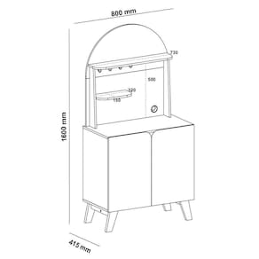 Características adicionais: 2 portas com dobradiças metálicas e cantos arredondados; Pés curvos de MDF 25mm; Estrutura em MDF/MDP de 15mm com pintura UV e acabamento fosco; 4 suportes metálicos para xícaras; 1 Passa fio