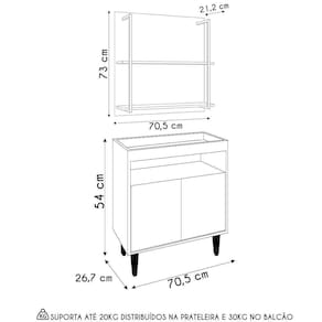 Peso Suportado: 20 kg distribuídos na Prateleira, 30 kg distribuídos no Balcão.