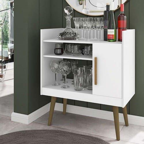 O Aparador Cantinho do Café II traz caracteristicas de um móvel Retrô, e é indicado pra você que sempre quis ter um espaço especial e aconchegante para receber suas visitas ou clientes. Mais um produto da Móveis Bechara, com designer atual, compacto e funcional, é indicado para pequenos espaços. Com ele você pode deixar o ambiente da sua casa ou escritório de cara nova. Produzido em MDP e pés em madeira maciça, possui 1 porta com dobradiças metálicas e puxador revestido em MDF, 2 prateleiras e 2 nichos, ideais para adaptar xícaras, cafeteiras, condimentos, potiches ou objetos de decoração conforme sua necessidade e criatividade. É possível acomodar garrafas de bebida em pé em seu espaço interno.