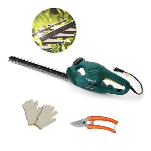 O aparador de cerca viva elétrico tekna cc500 é prático e eficiente, pois conta com uma lâmina de 500 mm de Comprimento com dentes afiados em ambos os lados, que cortam nos dois sentidos, permitindo realizar até 3800 golpes por minuto. É ideal para cortar e nivelar vegetações, arbustos, árvores e cercas vivas. Possui sistema bi-manual que só aciona a lâmina ao pressionar Dois botões ao mesmo tempo, garantindo a segurança ao operador. Com uma potência de 450 w, proporciona um ótimo rendimento no trabalho, Sem deixar de lado a ergonomia e conforto no manuseio.