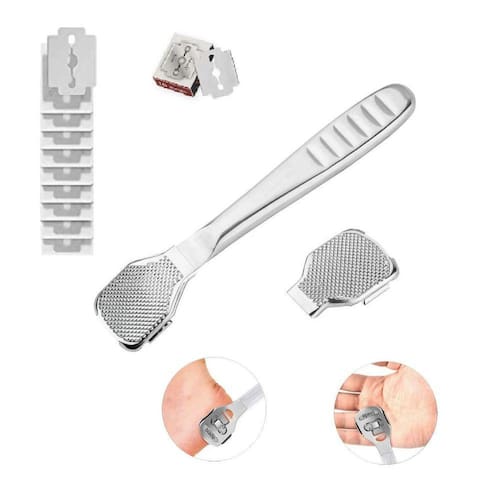 Removedor de calos e pele grossa para mãos e pés, produto de alta qualidade desenvolvido em 100% aço inox, acompanha kit com 10 laminas, elimine calosidades e pele grossa de forma segura, rápida, eficaz e indolor.