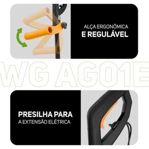 O wg ag01e possui um cabeçote com duas saídas para fio de nylon, ampliando significativamente a área de corte e proporcionando um acabamento mais uniforme e limpo. Além disso, seu design leve apenas 3 kg e a alça ergonômica ajustável permitem um manuseio fácil e confortável, ideal para a jardinagem sem esforços.