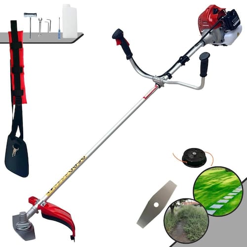Com guidão ergonômico lateral, permite um alcance amplo e maior mobilidade, capaz de aumentar a produtividade diária. Possui motor 2 tempos á gasolina, de 43 Cilindradas; 1,7HP de potência que proporcionam maior performance e economia na operação. Seu conjunto de acessórios inclui kit de ferramentas, cinto de suporte almofadado, carretel de nylon e lâmina de corte 3 pontas.