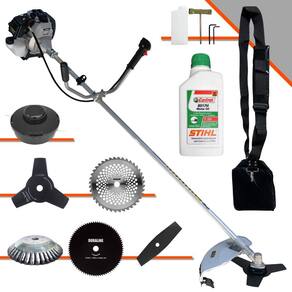 Roçadeira À Gasolina Toyama TBC43H 42,7cc 1,7HP 12.000rpm 2T + Faca 2 Pontas 330mm 2,7mm + Faca 40 Dentes 255mm 2mm + Faca 80 Dentes 255mm 1,5mm + Escova Rotativa 38 Cerdas 200mm + Óleo Castrol Stihl 500ml
