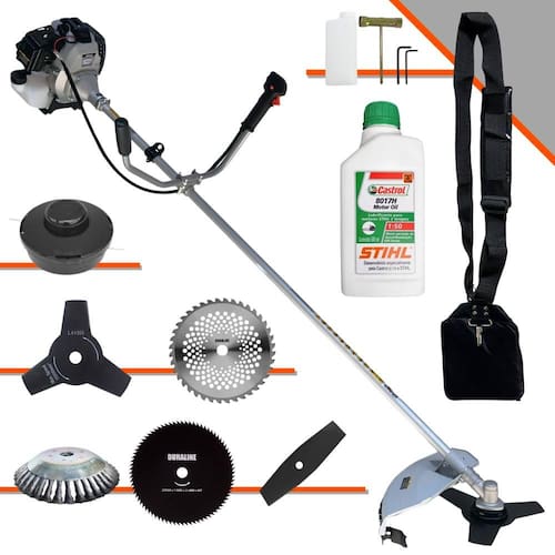 Com guidão ergonômico lateral, permite um alcance amplo e maior mobilidade, capaz de aumentar a produtividade diária. Possui motor 2 tempos á gasolina, de 42,7 Cilindradas, 12.000 de rotação 1,7HP de potência que proporcionam maior performance e economia na operação. Seu conjunto de acessórios inclui kit de ferramentas, cinto de suporte almofadado, carretel de nylon e lâmina de corte 3 pontas.