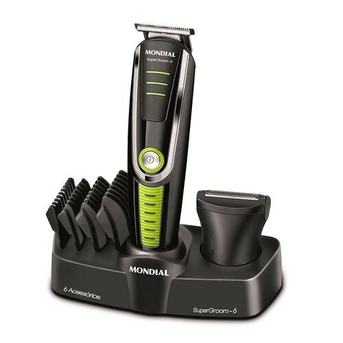 Solução rápida para um barbear perfeito ou aparar cabelo com o Aparador de Pelos Super Groom 6 BG-04 Bivolt: função 6 em 1, lâminas de inox, bateria recarregável que dura 90 minutos, base carregadora e 4 pentes de corte. O Aparador de Pelos BG-04 é preto, 6 em 1, e pode ser utilizado como: aparador maxi, microbarbeador e mais 4 pentes de cortes que são ideais para aparar e manter uniforme o comprimento dos pelos ou cabelo. O BG-04 possui lâminas de inox que oferecem maior durabilidade e alto desempenho para um corte rente e preciso e seus pentes de corte possuem as opções: 4 pentes guia com 3,6,9 e 12mm de altura, para aparar o cabelo ou barba. Fora isso o Aparador acompanha base carregadora que recarrega o aparelho diretamente na base. A sua bateria de litium (ou lithium) é recarregável e tem luz indicadora de bateria que indica o nível para carregamento. O BG-04 é bivolt. Tem 1 ano de garantia.