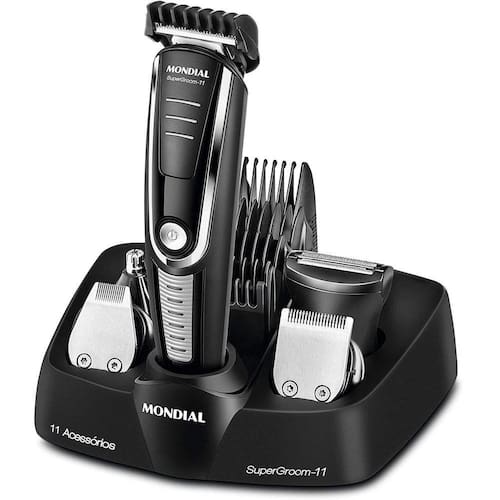 O aparador de Pelos Super Groom 11 da Mondial é a solução mais rápida para um barbear perfeito, além disso, com ele você também pode aparar os pelos de todo o corpo. Ideal para um barbear com maior precisão, praticidade e versatilidade ele possui design moderno 11 em 1: Aparador de barba e bigode, Aparador de precisão, Microbarbeador, Aparador de nariz e orelha, 5 Pentes de corte, 1 Pente com regulagem de altura com 16 comprimentos ideais para aparar e manter uniforme o comprimento dos pelos. Suas lâminas são em aço inox para uma maior durabilidade. Sua bateria interna é bivolt e com apenas 2 horas de carregamento você tem autonomia de 90 minutos e poderá carrega-lo para qualquer lugar sem preocupação.Marca: MondialModelo: BG-05Cor: PretoLâminas Aço InoxPentes 5 Pentes de corte 3 mm, 6 mm, 9 mm, 12 mm, 15 mm Voltagem BivoltPotência W 5WConsumo KW/h 0,005Kw/h Conteúdo da Embalagem:1 Aparador de pelos completo5 Cabeças aparadoras5 Pentes de corte 3 mm, 6 mm, 9 mm, 12 mm, 15 mm 1 pente ajustável 16 comprimentos 1 Óleo lubrificante1 Carregador1 Base carregadora1 Manual de instruções e manual de assistência técnica Dimensões da Emabalagem:Altura: 25cmLargura: 21cmProfundidade: 8cmPeso: 0,716g Garantia de 1 Ano Ofertada pelo fabricante